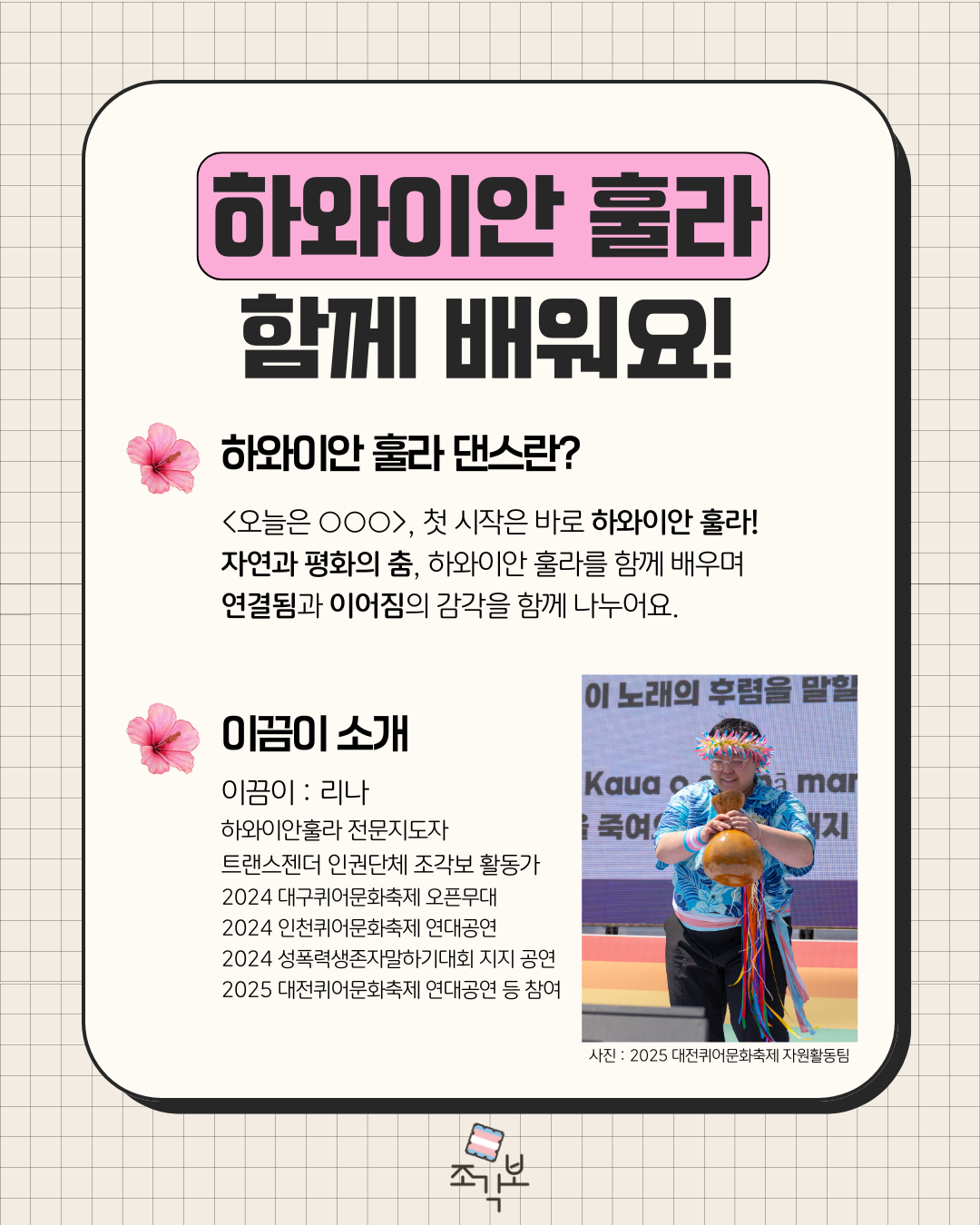 * 하와이안 훌라, 함께 배워요! - 프로젝트 소모임 <오늘은 ○○○>, 첫 시작은 바로 하와이안 훌라! 자연과 평화의 춤, 하와이안 훌라를 함께 배우며 연결됨과 이어짐의 감각을 나누어요. 사랑과 연대를 노래하는 하와이 노래, <Pearly Shells>와 <Lei Ho'oheno>를 훌라와 함께 배워요.