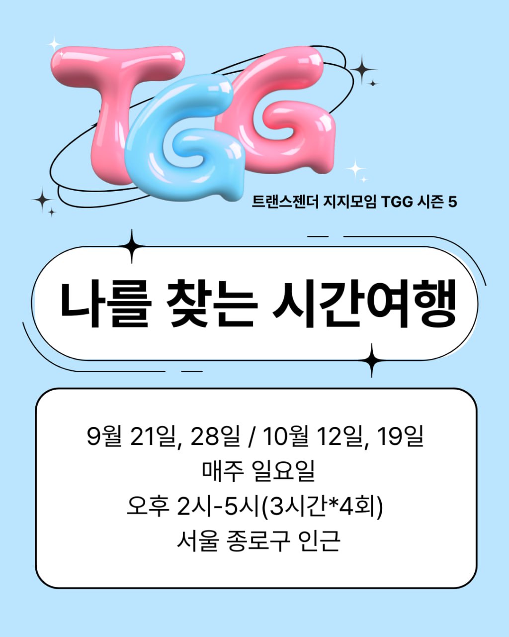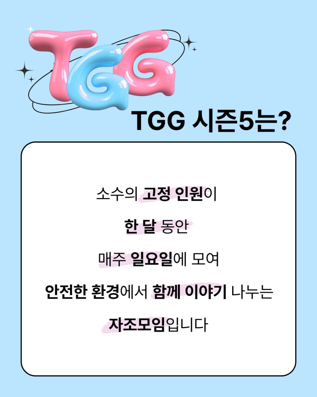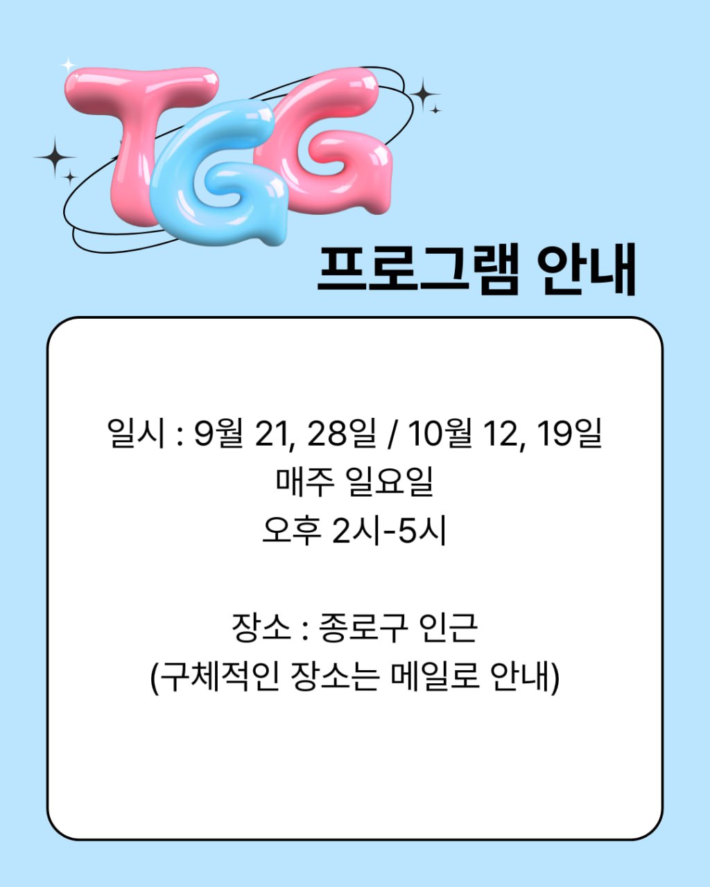 - TGG는 트랜스/젠더퀴어 정체성을 가진 참여자들이 일상의 경험과 이야기를 나누는 당사자 모임입니다. 따라서 원활한 행사 진행을 위해 시스젠더의 참가를 제한합니다.