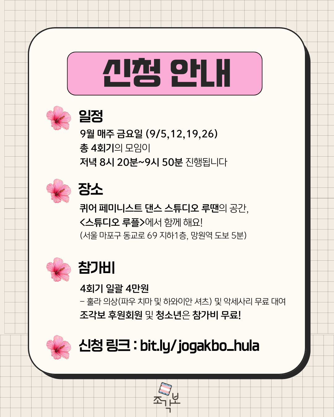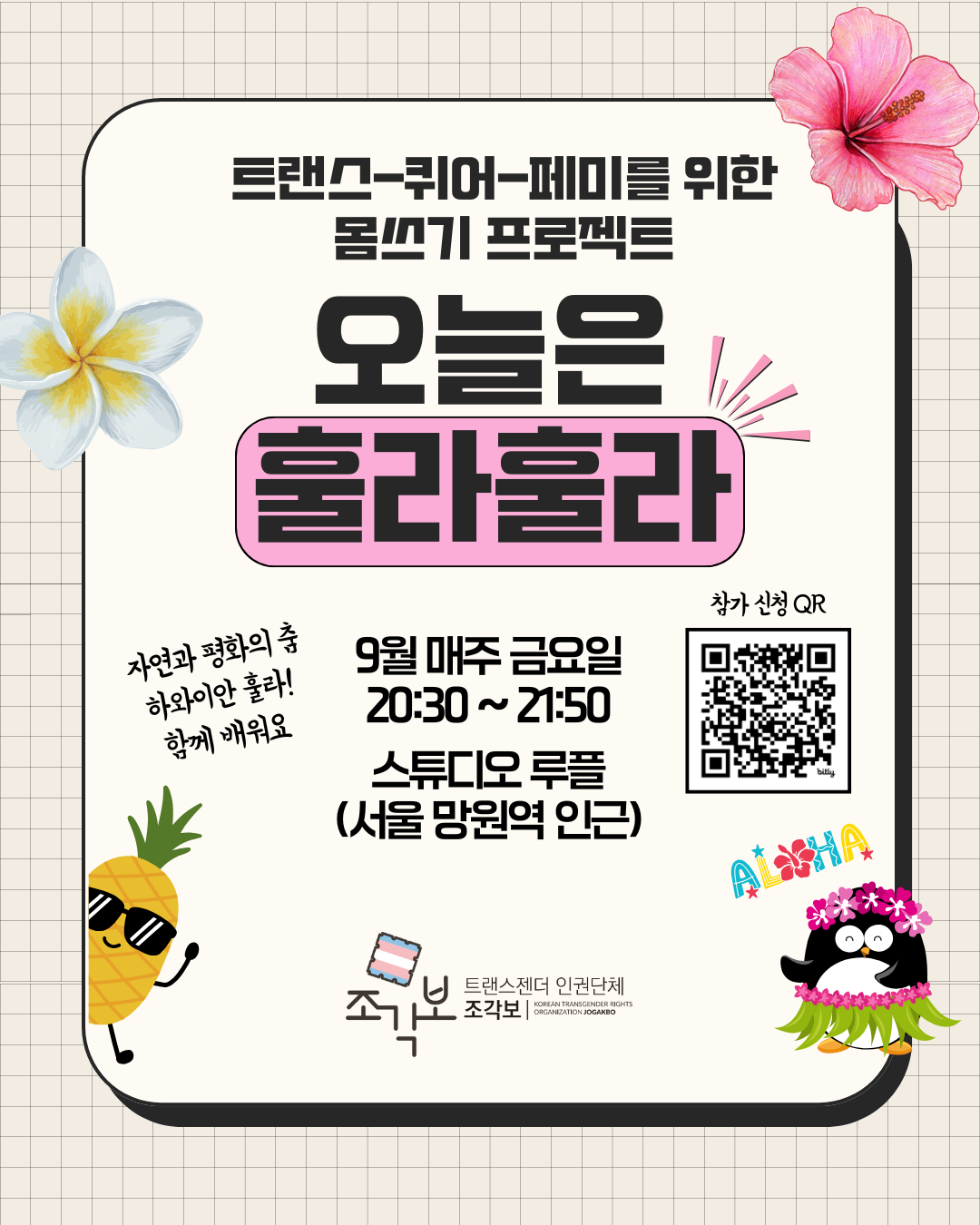 - <오늘은 훌라훌라>는 하와이안훌라 전문지도자이자 조각보 활동가인 '리나'가 이끔이로 함께 하며, 퀴어 페미니스트 댄스 스튜디오 루땐의 공간, 망원의 <스튜디오 루플>에서 진행됩니다.