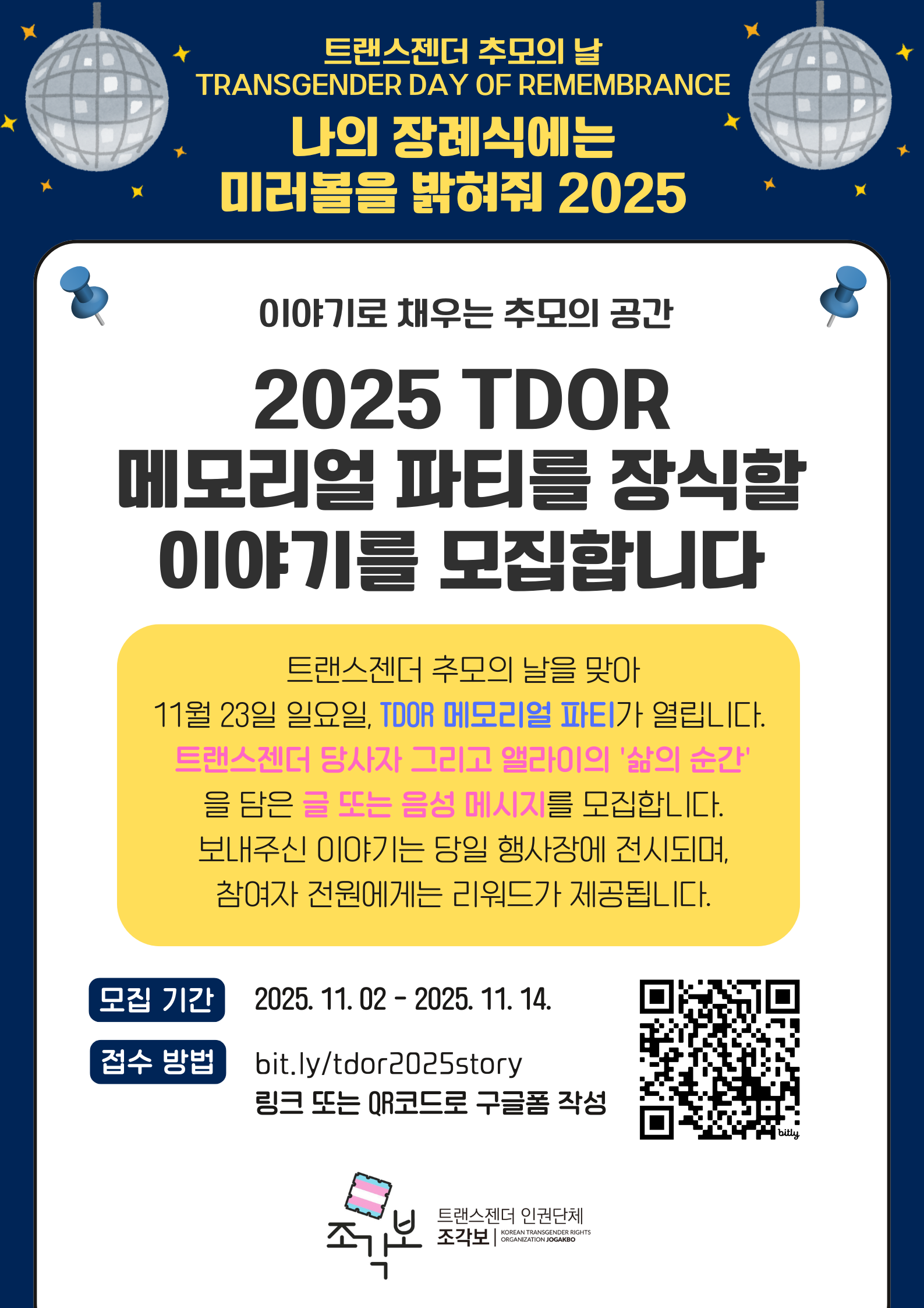 (이미지 설명 : 2025 조각보 TDOR 행사 이야기 공모 웹자보. 기재된 내용은 하단의 텍스트와 같습니다.)