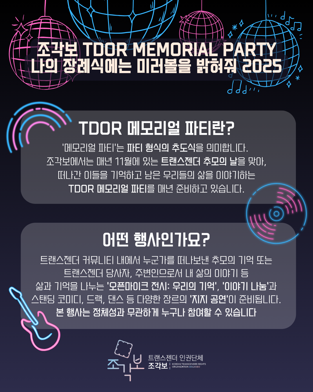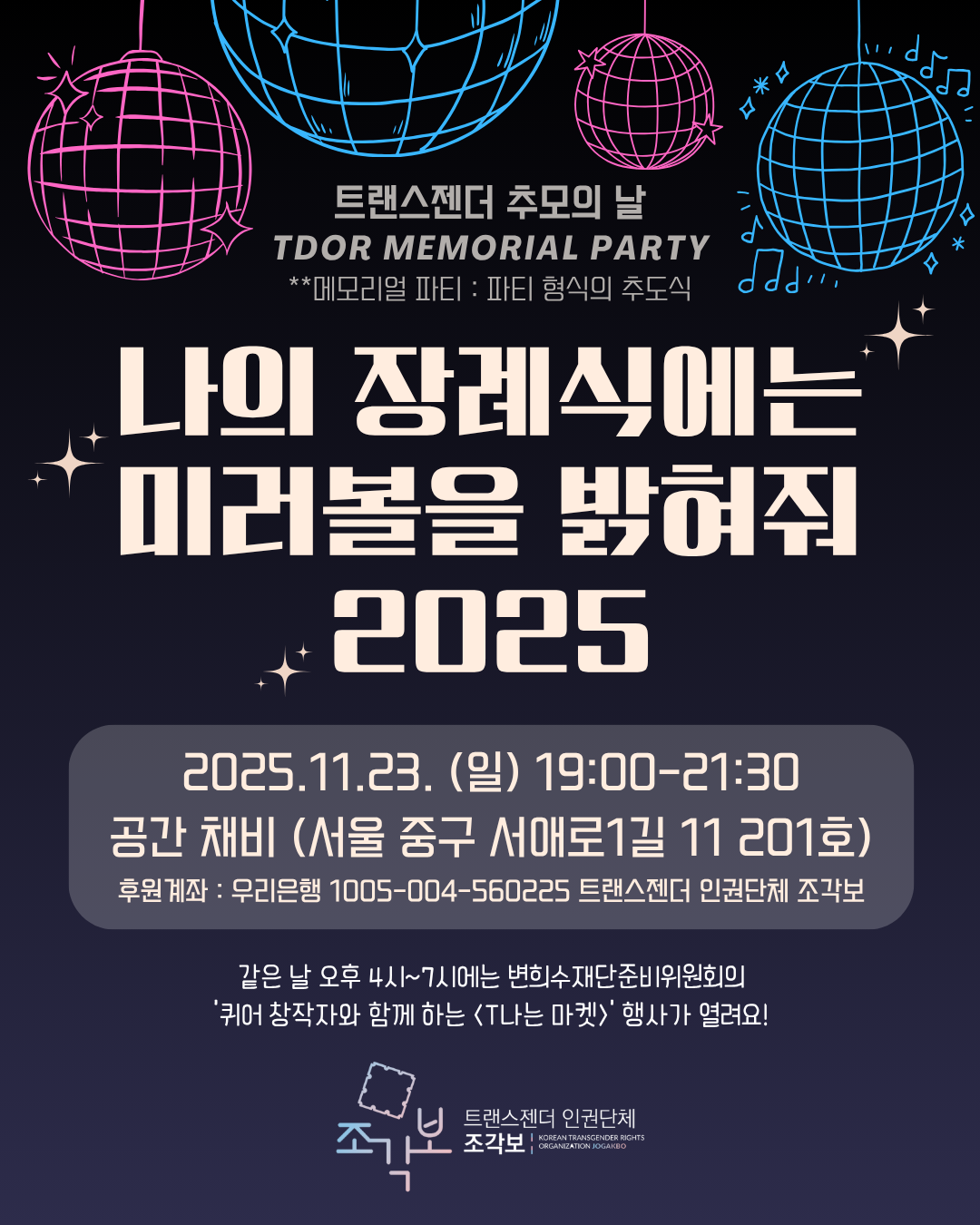 - 매년 11월은 트랜스젠더 추모의 날(TDOR)이 있습니다. 조각보는 작년에 이어 파티 형식의 추도식을 뜻하는 <메모리얼 파티>로 이 날을 기념하고자 합니다.