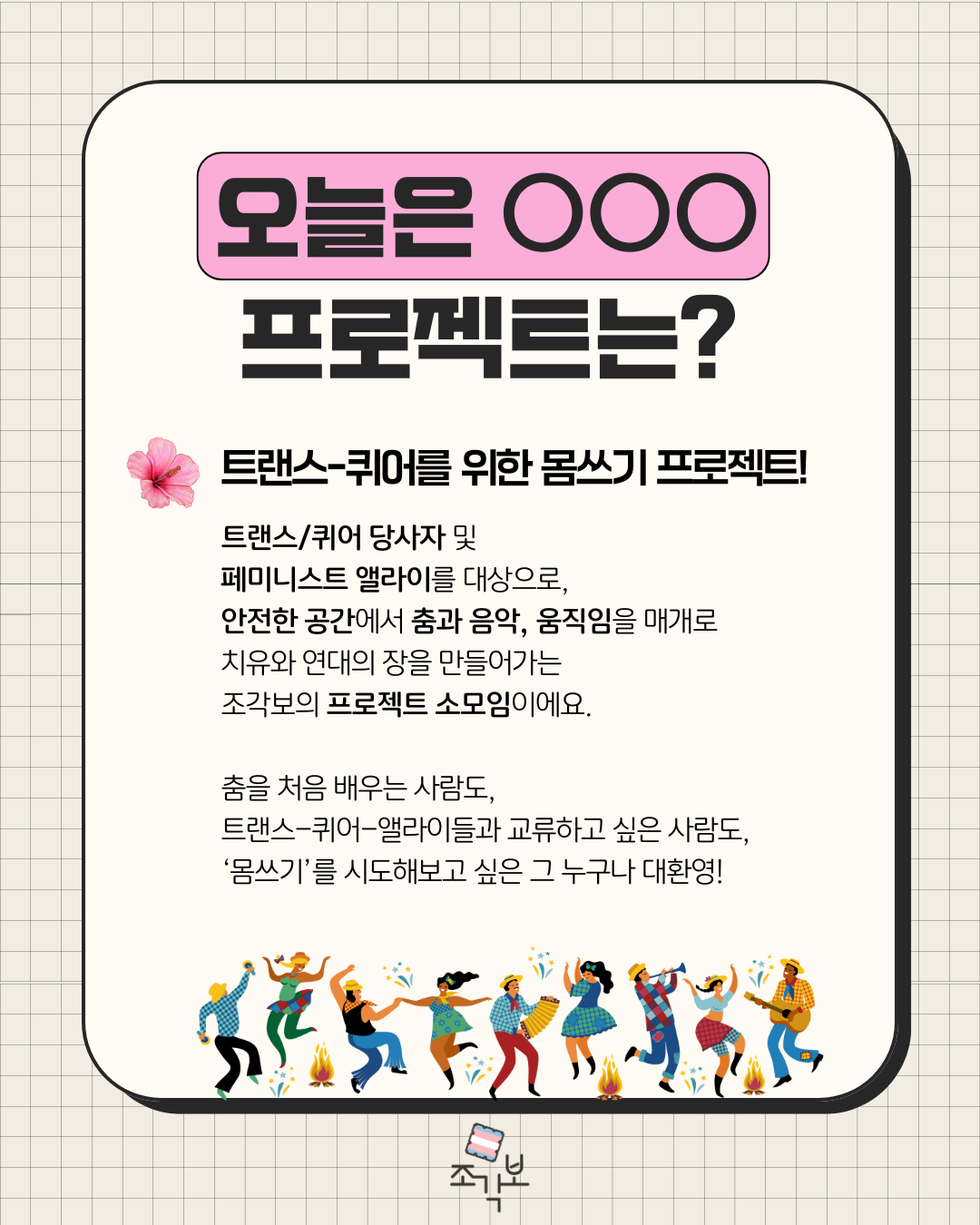 * <오늘은 ○○○> 프로젝트는? - 트랜스/퀴어 당사자 및 페미니스트 앨라이를 대상으로, 안전한 공간에서 춤과 음악, 움직임을 매개로 치유와 연대의 장을 만들어가는 조각보의 프로젝트 소모임이에요.