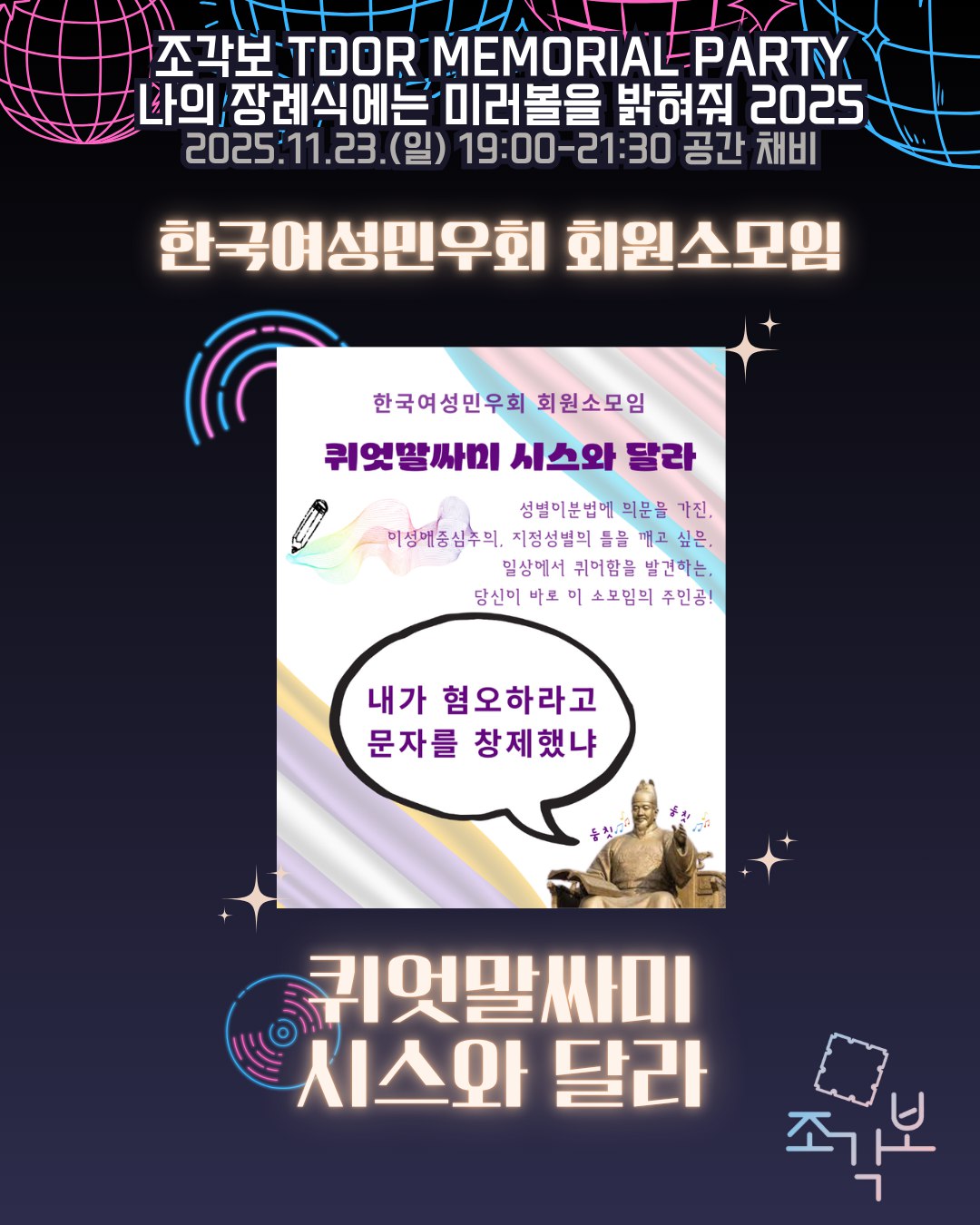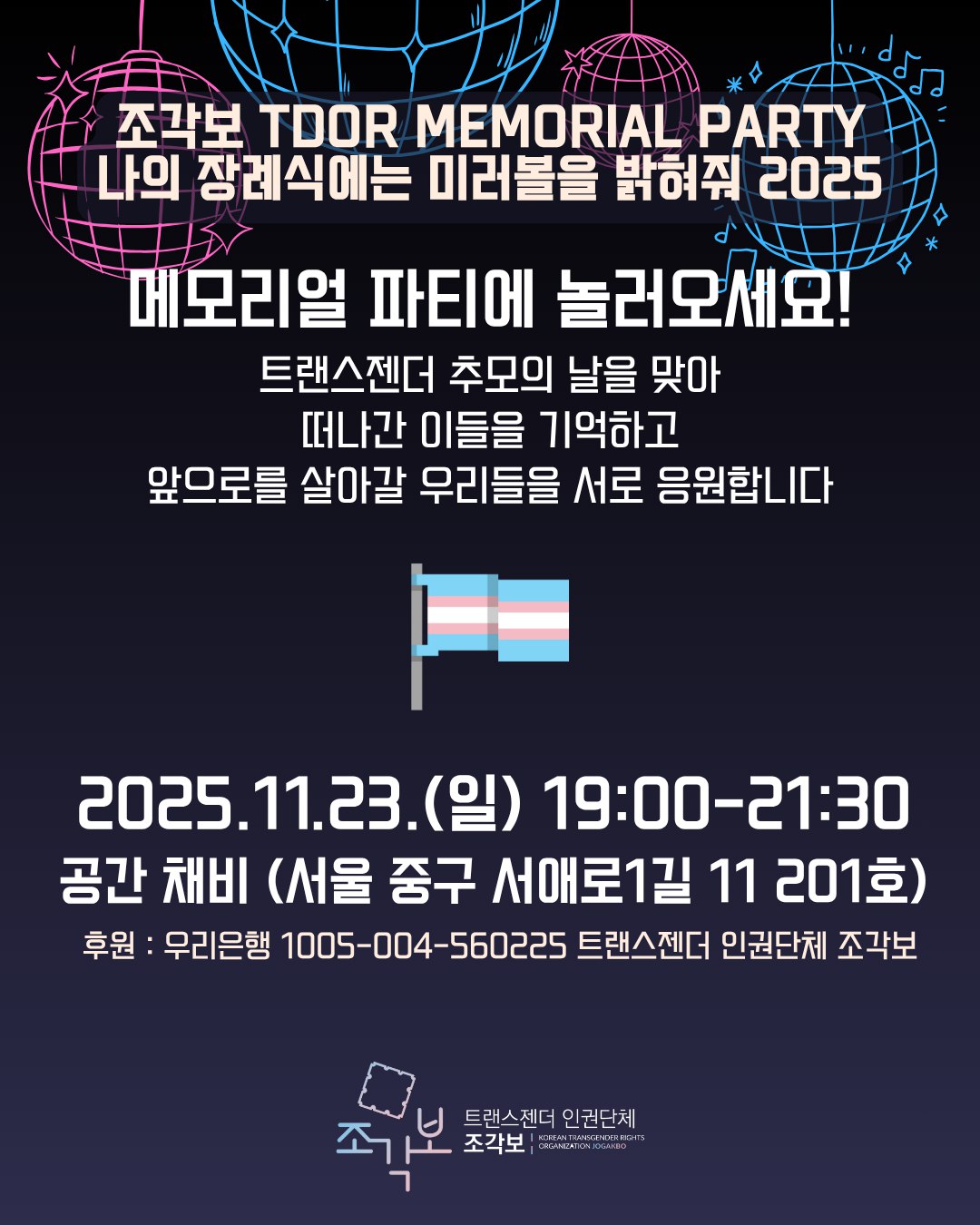 - 매년 11월은 트랜스젠더 추모의 날(TDOR)이 있습니다. 조각보는 작년에 이어 파티 형식의 추도식을 뜻하는 <메모리얼 파티>로 이 날을 기념하고자 합니다.