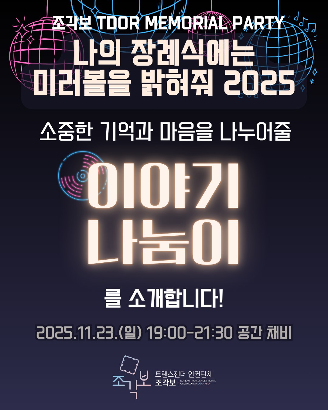 ◈ TDOR 메모리얼 파티란? - 매년 11월은 트랜스젠더 추모의 날(TDOR)이 있습니다. 조각보는 작년에 이어 파티 형식의 추도식을 뜻하는 <메모리얼 파티>로 이 날을 기념하고자 합니다. - 이번 파티의 키워드는 <환대>와 <지지>입니다. ‘추모’가 마냥 어렵고 무거운 것이 아니라, 떠나간 이들을 기억하고 지금을 살아가는 우리들이 용기와 희망을 얻을 수 있도록 연대와 지지의 파티를 준비했습니다.