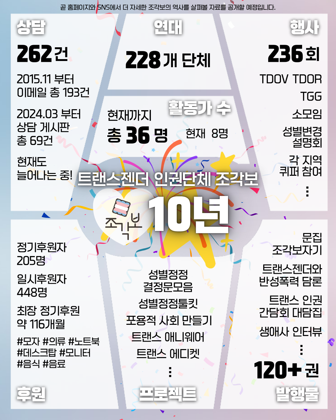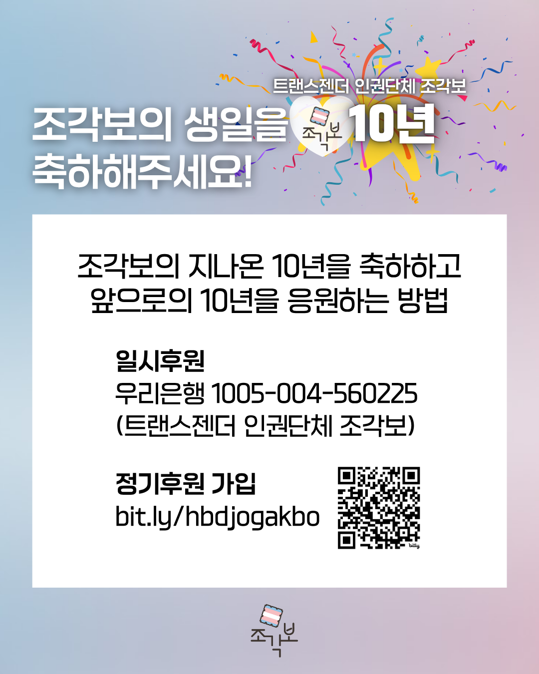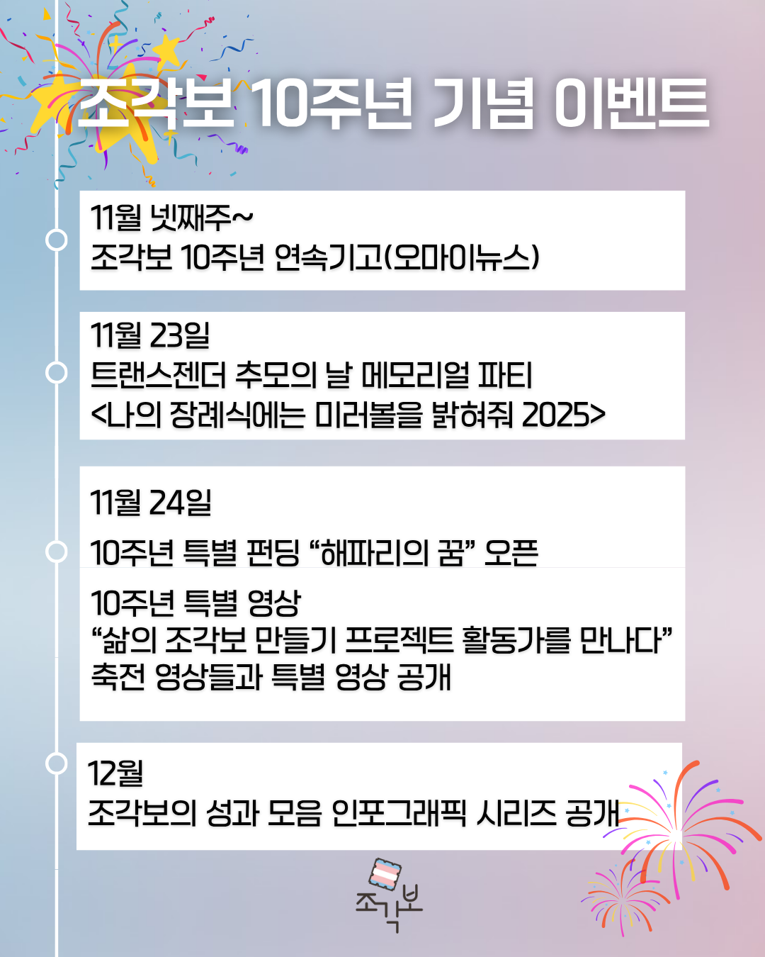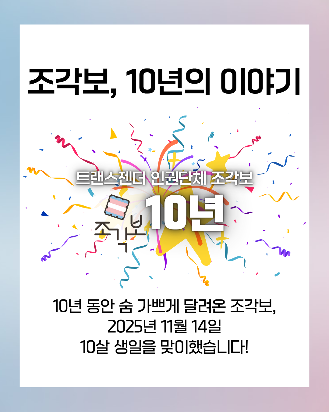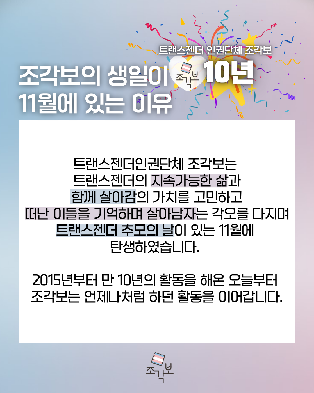 2015년 11월, 트랜스젠더 추모의 날(TDoR)을 기리며 '트랜스젠더의 지속가능한 삶과 함께 살아감의 가치'를 다짐하며 첫발을 내디뎠던 조각보가, 2025년 11월 14일 오늘, 드디어 10살 생일을 맞이했습니다! 🎂